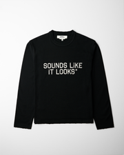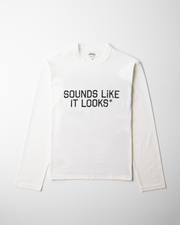 True-to-size fitted long-sleeve shirt crafted from lightweight fabric for a smooth drape. Features a ribbed collar, a prominent Sounds Like it Looks* logo on the front, and subtle frayed hems for a stylish touch.