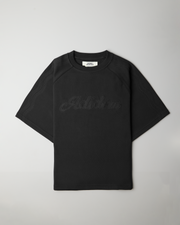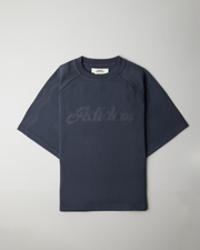 Our core tee is converted to a raglan sleeve and features a chain-stitch-filled cursive logo on the front. It fits true to size, is slightly cropped and is finished with a ribbed collar. The middle of the raglan is detailed with a curved row of chain stitching from the neck to the hem.