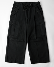 Designed for an oversized fit, these pants feature a drawstring waistband and belt loops for a secure closure. Shaping darts and exaggerated pleats at the waist and knee enhance the fullness, while cargo and flap pockets add functional construction details. A standout piece for bold styling.