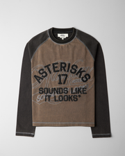 A boxy long-sleeve crewneck with a relaxed, oversized fit and raglan-style sleeves for ease of movement. The shirt features bold layered embroidery across the front, combining oversized lettering with overlapping Collegiate logo. The dense stitching and layered design give the graphics a textured, three-dimensional quality. Finished with exposed stitching at the seams and hem, the piece blends casual comfort with statement detailing.