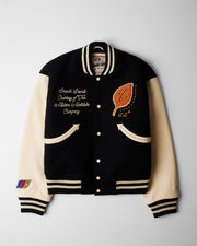 A signature seasonal style, this classic varsity bomber is reimagined with a standard collar and our signature smiling welt pockets. Crafted from rich melton wool, the jacket offers structure through its premium French calfskin and a quilted lining that adds warmth, buffness, and weight.