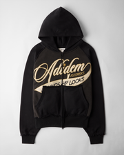 Loose and oversized fitted hoodie features a double-faced hood, raglan sleeves and distressed seaming along the hems and pockets. Details include a front body panel stone washed for contrast and a large chain-stitch logo outlined with an embroidered stroke across the front body.