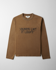 True-to-size fitted long-sleeve shirt crafted from lightweight fabric for a smooth drape. Features a ribbed collar, a prominent Sounds Like it Looks* logo on the front, and subtle frayed hems for a stylish touch.