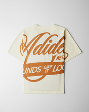 The box-fitted shirt has wide sleeves, a premium ribbed collar, and is fabricated with midweight slub cotton. Logo hits include an embroidered cursive logo on the front left chest and a prominent screen print stretching across the entire back. Made in Slub Cotton